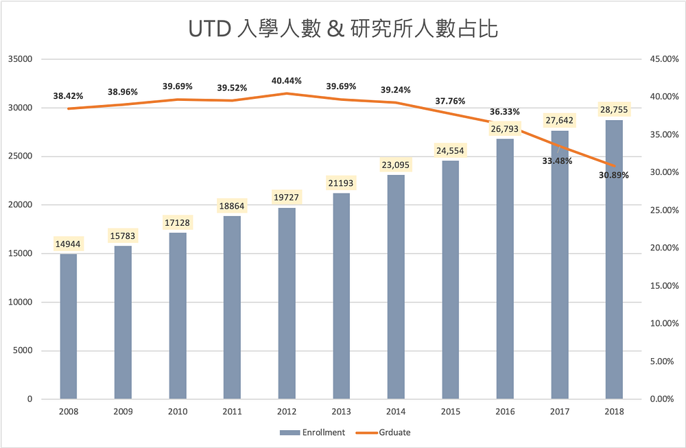 - UTD 入學總人數約28000人,研究生人數逐年減少,2018年占30.89%