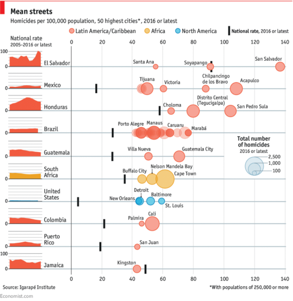 這篇來自經濟學人 Graphic detail 的 The world’s most dangerous cities。他們根據巴西一家獨立機構 Igarapé Institute 做的 Homicide Monitor 發現2016年兇殺比例最高的前50座城市裡有43座來自中南美洲,而中南美洲不過10個國家,其中8個國家都在榜上。