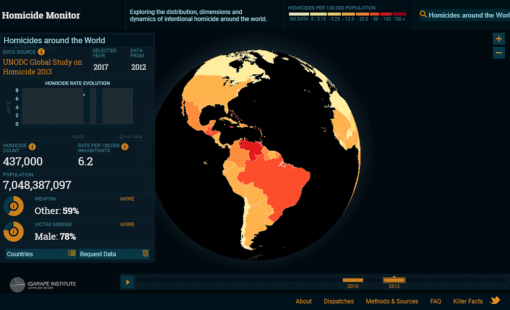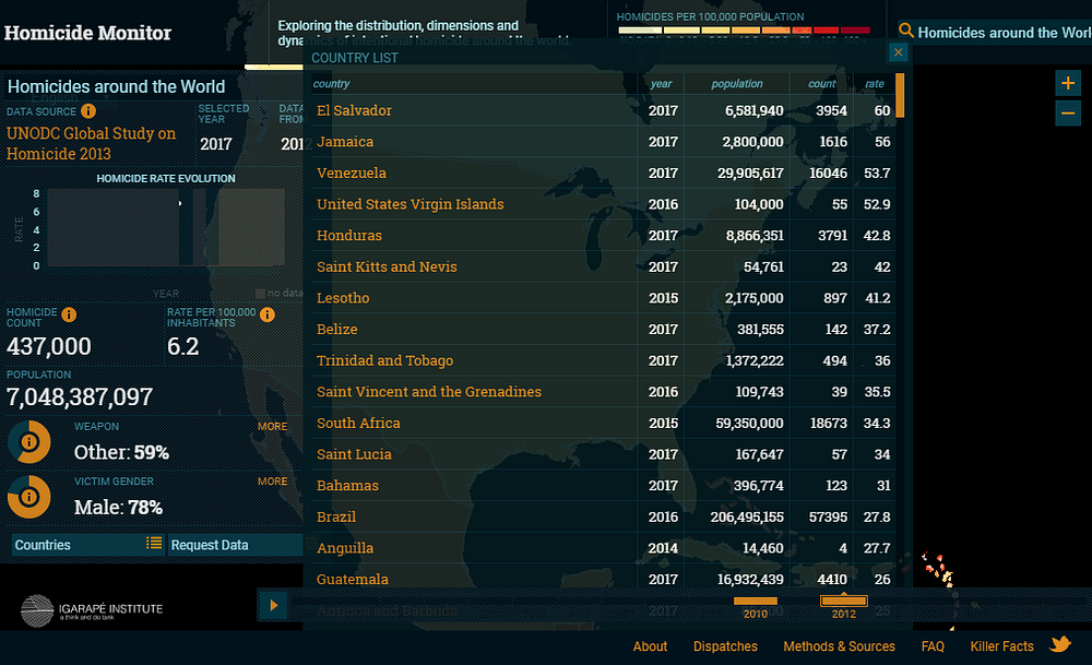 圖表左邊是國家2005年到近幾年的兇殺比(每10萬人有多少人被殺),由於有些國家沒有開放資料或是沒有最新的資料,所以沒辦法完全互相比較。右邊的大小圓圈則是國家內幾座城市(共50座)的兇殺指數。