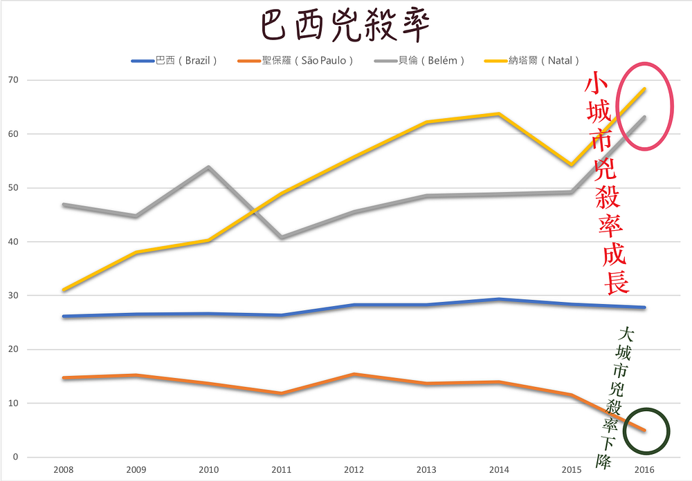 進一步觀察每年的數字,近兩年的兇殺分布有些改變,數據顯示,大城市的兇殺率在減少,小城市則在增加,如貝倫(Belém)和納塔爾(Natal)的兇殺率五年內成長超過20%,而人口最多且最繁華的城市聖保羅(São Paulo)在2015至2016年之間減少了781件兇殺案,兇殺率下降60%。不過,整個巴西於2016年仍然有57,395人喪生,兇殺率也始終沒有改善。