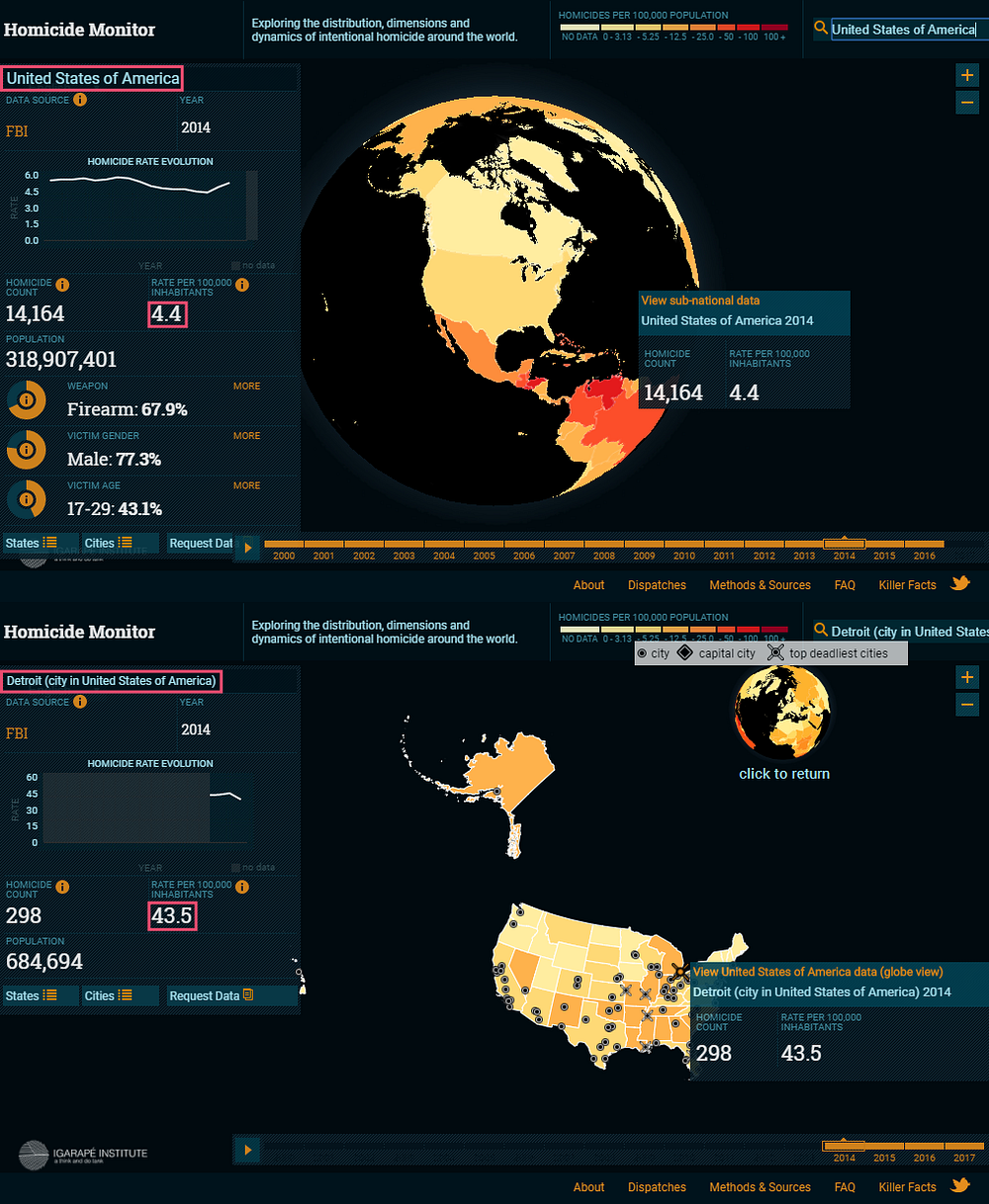 前50名的危險城市幾乎都位於拉丁美洲,只有少數城市位於美國和南非。而美國也是名單中唯一富裕且為已發展國家,其城市底特律、新紐奧良、聖路易(St Louis)以及巴爾的摩(Baltimore )都榜上有名,他們有些兇殺率更是驚人地近似美國平均值的10倍,如2014年美國平均兇殺率為4.4,聖路易為49.9、底特律是43.5,新紐奧良為38.7、巴爾的摩則是33.8。造成美國兇殺案的主要武器是槍枝,占了近乎七成。