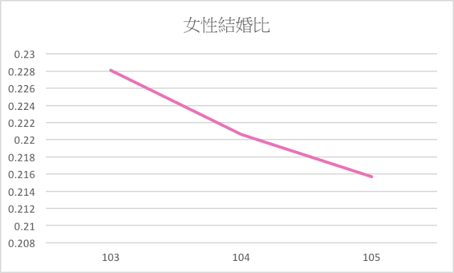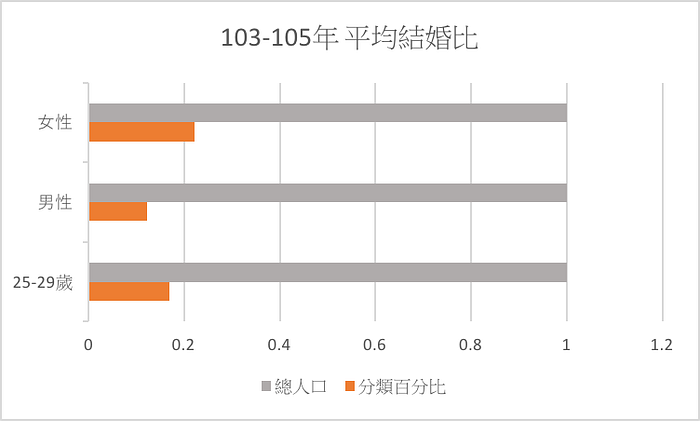 上面這張圖是103-105年的平均結婚比,25–29歲的人結婚佔全臺灣人數17%,而女性普遍比男性高,女性在這個年齡層結婚的機率爲全臺女性的22%,男性則是12%。