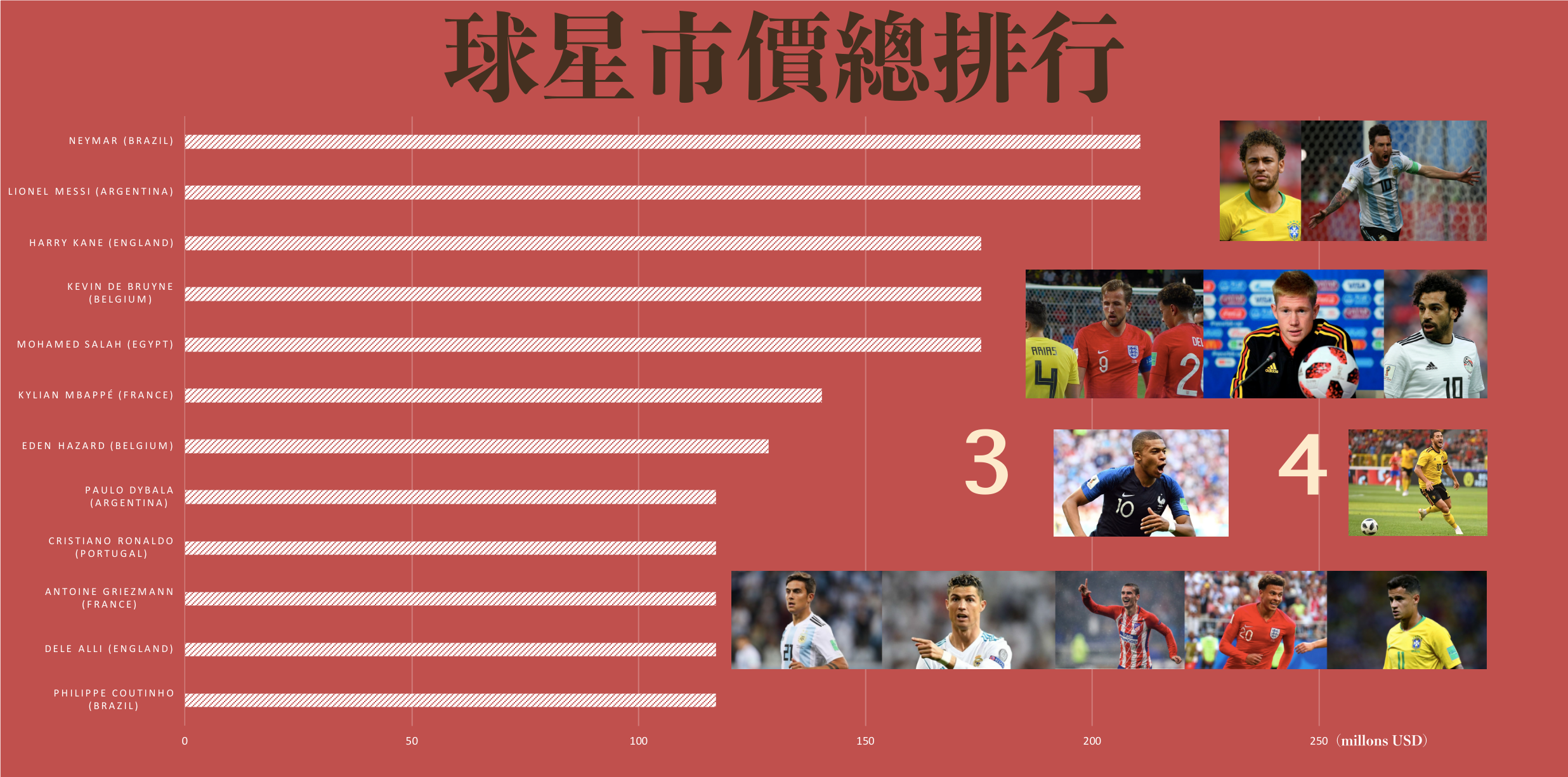 接著,我們看到今年34個全部參賽的國家各球員一同排名的市價排行前10名,第一名由巴西內馬爾(Neymar)和阿根廷梅西(Lionel Messi)並列,接著是英格蘭的隊長哈里凱恩(Harry Kane)、比利時的 Bruyne、埃及 Salah 位居第二,而我自己覺得會占高位的葡萄牙C羅(Cristiano Ronaldo)則為第五名。不過,比賽打到現在,價值最高兩位早已經離開世足場地,C羅也是如此,應該不只出乎觀眾的意料之外,也跌破許多專家的眼鏡吧,若你是有根據地在玩運彩,怕也輸很慘。