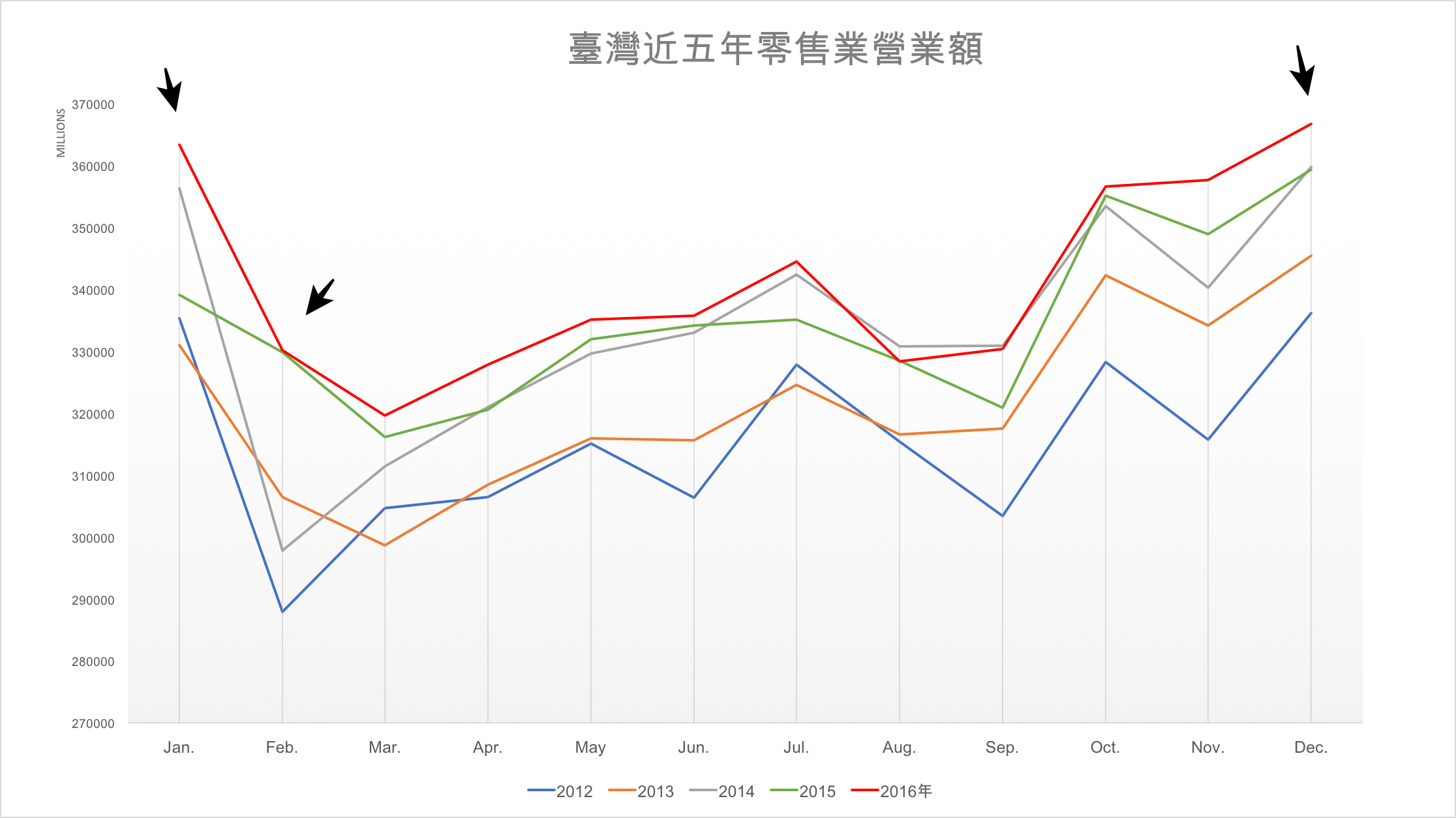 從零售業的營業額來觀察,臺灣經濟部統計處公布的近五年各月份數據指出,大家在10月的消費力飆升,11月趨緩,12月、1月戰鬥力最高(我原以為是11、12月)。10月份呢,臺灣各百貨週年慶,又巧逢雙十連假增加購買慾,年底更是全世界普天同慶的跨年,1月份則是我們專有的農曆春節準備期!「每條大街小巷,每個人的嘴裡,見面第一句話,就是恭喜恭喜(唱歌~~ 」家家戶戶籌備禮物送人或是積存糧食好過年的景象正浮現於我腦海。