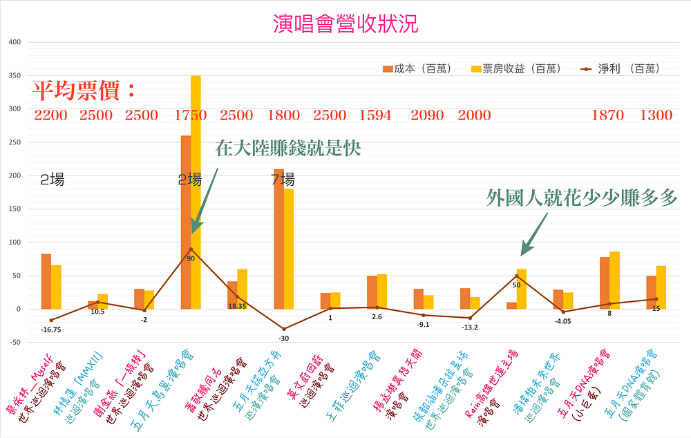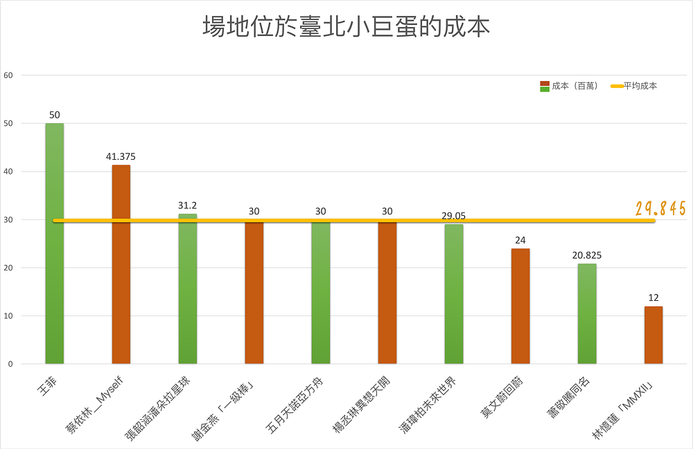 這是部分藝人於小巨蛋的花費狀況和平均,平均為29.845百萬,藝人以及經紀公司就必須評估多少張票賣多少錢會賺,至少不要賠太多吧。(我將五月天於小巨蛋的DNA演唱會拿掉,他們的成本78百萬太高,極端值平均下來感覺會偏差太多。)