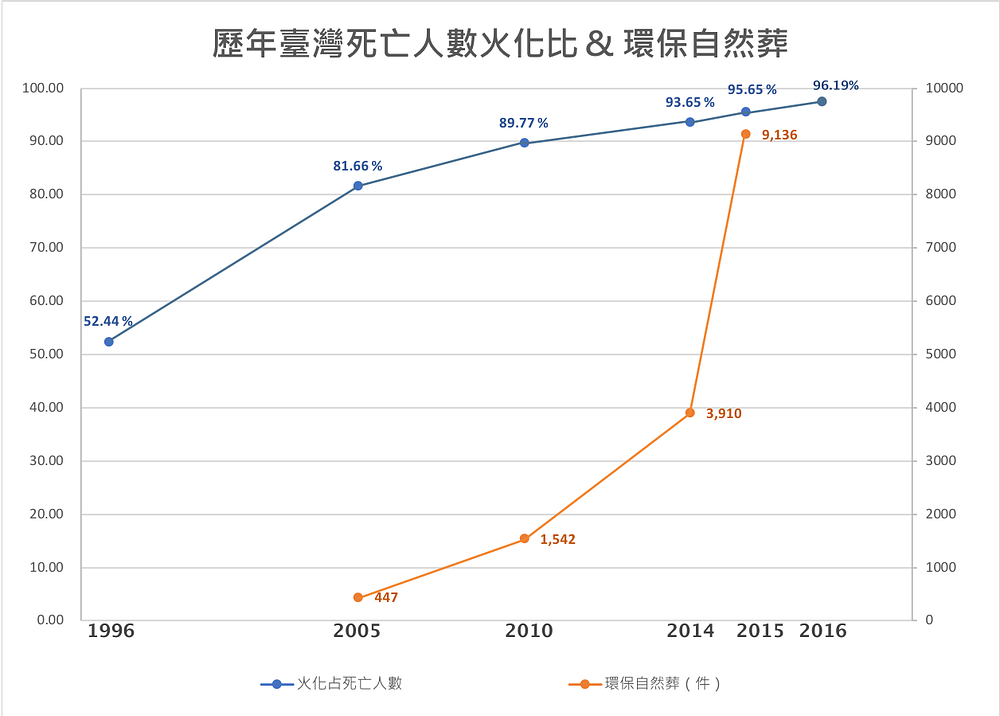 根據臺灣直轄市、縣(市)政府蒐集各殯儀館及內政部發布的數字,可以看到歷年的死亡人數火化比逐年增高,我們回過頭至1996年,當時火化的人只占死亡人數的52.44%,20年後竟多到96.19%,整整增加超過43個百分點。