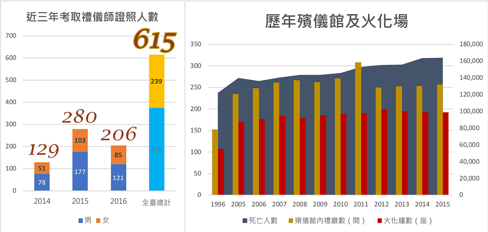 死亡人數、殯儀館廳數、火化爐數的穩定成長,臺灣邁入高齡化社會眾所皆知,老年死亡人口超過7成仍在80~90歲間,儘管醫術發達,也還是未能保證長命百歲。人死亡後的遺體在經過火化、進入納骨塔前的種種儀式,皆由禮儀師規劃、主導。隨著社會人口結構的改變,禮儀師的地位日顯重要,然而,全臺目前總共只有615位,2016年被火化的屍體數有172,829具,若是大家都舉行儀式,平均一位禮儀師要服務281具遺體,感覺已經很吃不消了,未來死亡人數繼續增加,禮儀師供不應求阿。