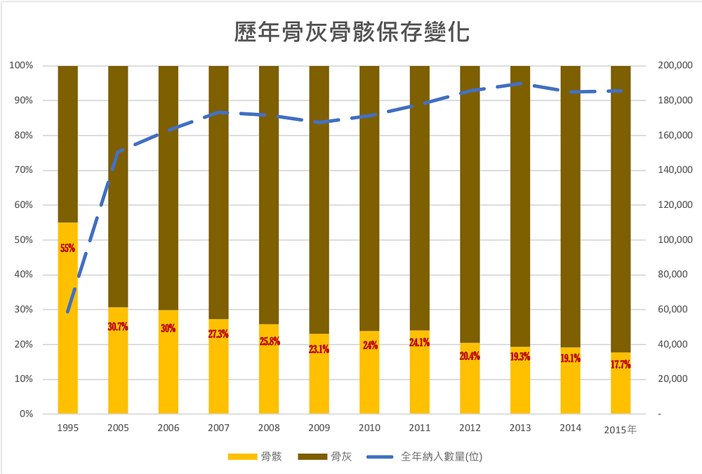 臺灣骨灰保存於1995年占45%,骨骸保存占55%;2015年臺灣骨灰保存占82.3%,骨骸保存占17.7%