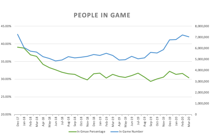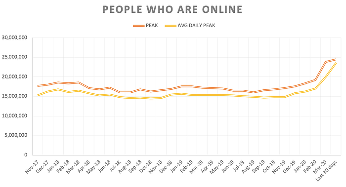 This has caused some to ask whether activities such as gaming and streaming are slowing down the internet for those working from home. Let’s see if gamers as a percentage of internet users has increased, and — if so — whether my slow internet is their fault.